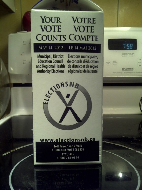 In past years, voter turnout for municipal elections has been dismal (35% of Rothesay voters GOTV in the 2008 election). The New Brunswick government is doing an excellent job at trying to GOTV for the 2012 municipal election. There is a wealth of information for voters and for candidates atwww.electionsnb.ca This morning, as I reached for the milk in the fridge, an advertisement for the May 14th election caught my eye on the side of the milk carton. Northumberland Dairies has teamed up with Elections NB to encourage voters to GOTV.